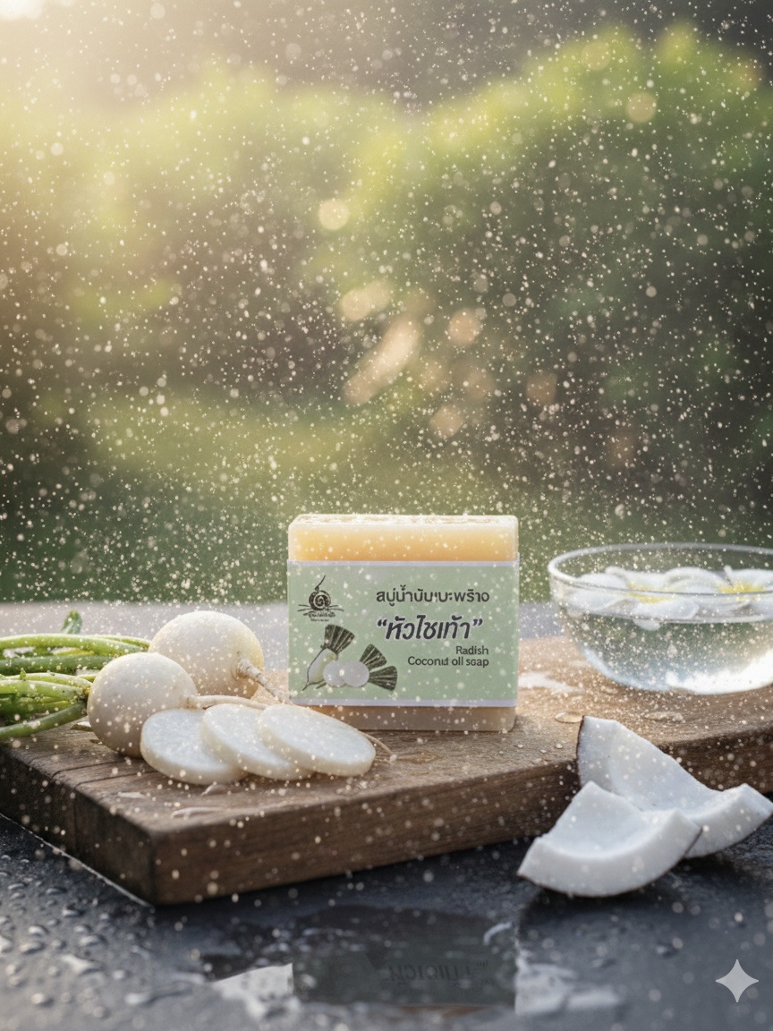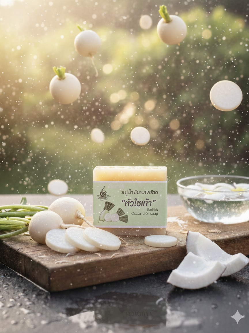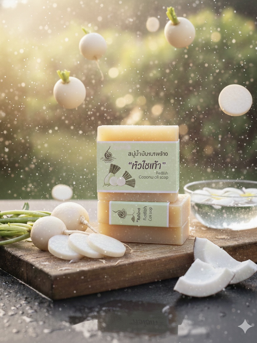 สบู่น้ำมันมะพร้าว “หัวไชเท้า” คือ สบู่ทำความสะอาดผิวที่ผสานคุณค่าจากน้ำมันมะพร้าวและสารสกัดหัวไชเท้า ช่วยทำความสะอาดผิวอย่างอ่อนโยน พร้อมช่วยให้ผิวดูสะอาด เรียบเนียน และสดชื่น