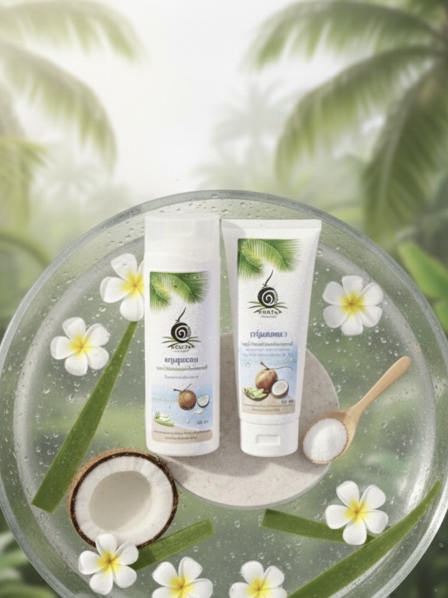 แชมพูมะพร้าวช่วยทำความสะอาดเส้นผมและหนังศีรษะอย่างอ่อนโยน ส่วนครีมนวดช่วยเติมความชุ่มชื้น ฟื้นฟูผมแห้งเสีย ทำให้ผมดูสุขภาพดี มีน้ำหนัก และจัดทรงง่ายขึ้น